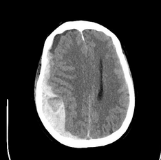 On ICU arrival, the temperature is 37.8°C, heart rate is 89/min, BP is 156/85 mm Hg, and respiratory rate is 25/min without spontaneous respiratory efforts with volume targeted assist-control ventilation. The patient is unresponsive without movement to painful stimuli, with dilated, minimally reactive pupils and no cranial nerve reflexes on rapid neurologic assessment. General examination demonstrates scattered crackles, a palpable spleen, and 1+ bilateral lower extremity edema. The WBC count is 150,500/μL (150.5 × 109/L) with 34% circulating blasts and multiple immature WBC and RBC forms. Laboratory test results are shown in Figure 1. The creatinine level is baseline normal. There is a mildly elevated lactate dehydrogenase level and unconjugated hyperbilirubinemia. Prothrombin and partial thromboplastin times are normal. Representative images of the chest CT scanning performed on admission and head CT scanning performed after intubation are shown (Figure 2 and Figure 3).
