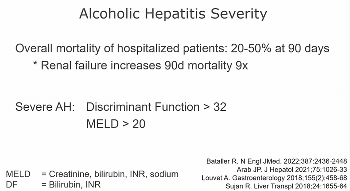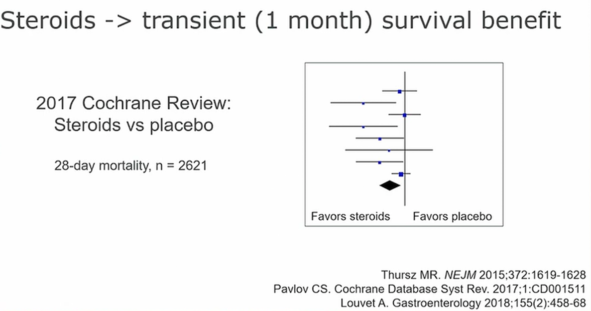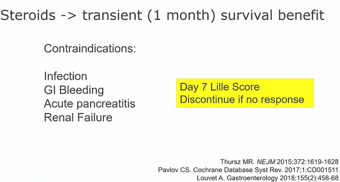 - Severe: prednisolone (STOPAH trial showing improved 28 day mortality)