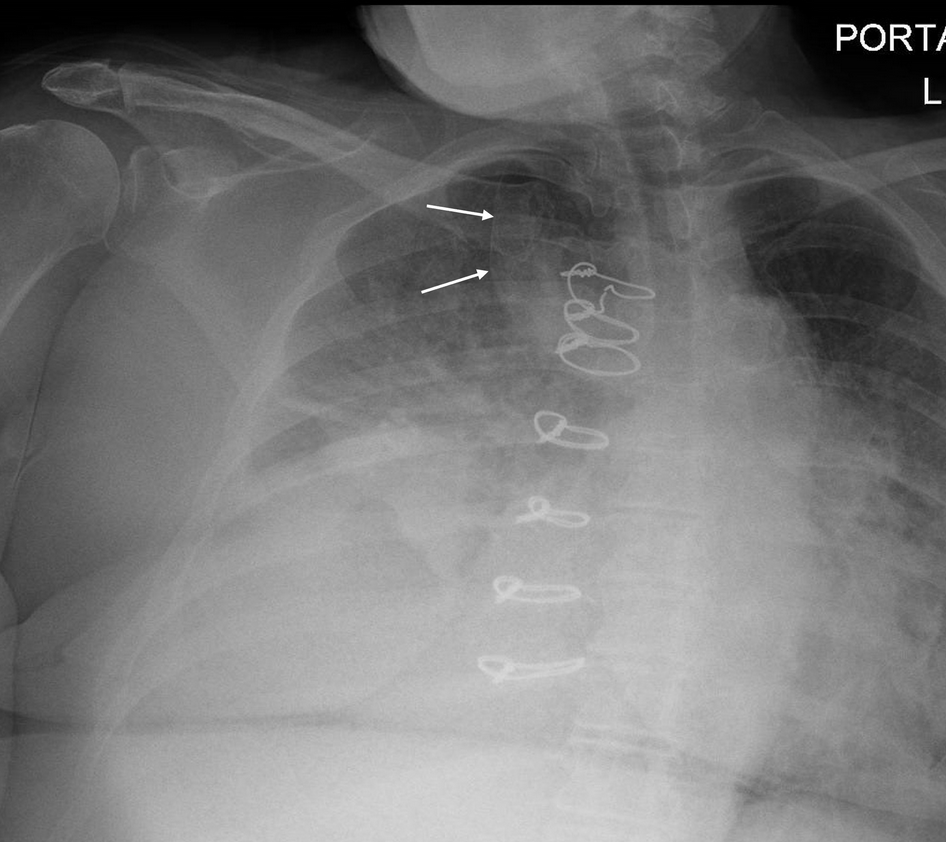 Normal anatomic variation is important for the intensivist to recognize so that findings are not confused for pathology. This chest radiograph shows an azygos fissure—the most common accessory fissure, present in roughly 0.5% of patients. The azygos fissure and lobe form during embryology, when the posterior cardinal vein (precursor of a segment of the azygos vein) aberrantly migrates through the upper lobe. As a result, two layers of pleura are carried through the lobe to produce the azygos fissure. This can be confused with abscess, bulla, or pneumothorax. The structure is even more readily evident on CT scanning (Figure 2). An azygos lobe is not a true lobe because it lacks a bronchus. There is no medical significance to an azygos fissure, but it does require awareness by an operating surgeon.
