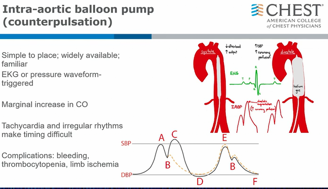 Balloon pumps have been around for a long time. It is easy to place and widely available. Balloon pump is a central arterial catheter around 8 Fr in size that’s placed either via femoral or via axillary and sits in aorta. It inflates in diastole at dicrotic notch, increasing diastolic pressure and retrograde flow to improve coronary artery perfusion. Inflation also helps antegrade flow to the mesentery and lower bodies. It deflates right before systole to allow antegrade flow from native heart.