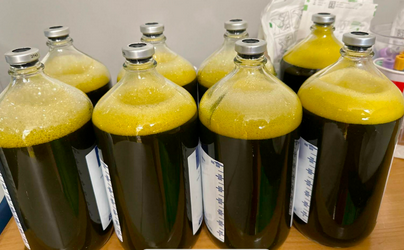 Collection bottles with typical, green-colored fluid drained via large-volume paracentesis in patient with choleperitoneum.