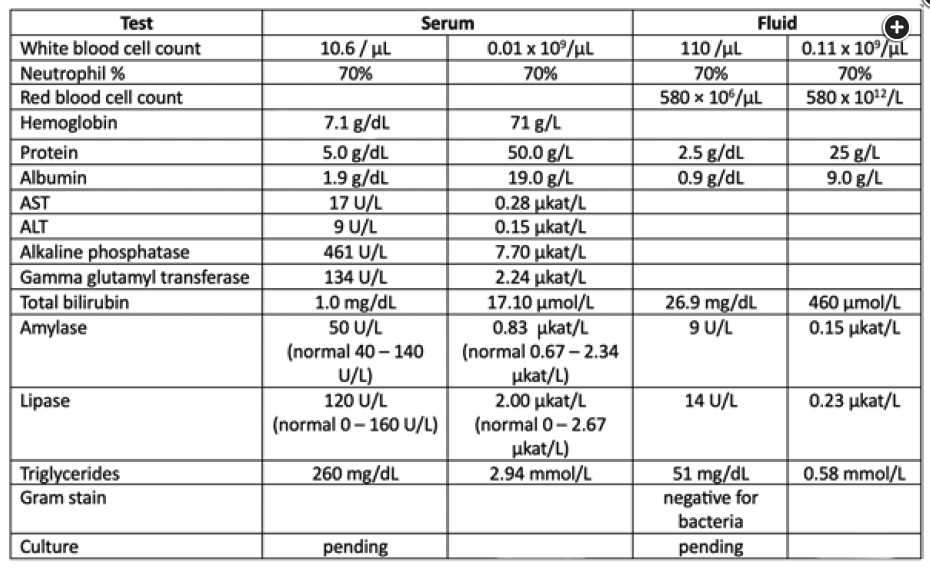 A 52-year-old patient who was in a motor vehicle accident underwent urgent laparotomy and cholecystectomy for management of a ruptured gall bladder. He was recovering well until the fourth postoperative day, when he developed abdominal distention. The following day, the abdominal distention was worse, and he had mild abdominal pain. He was afebrile with a BP of 112/70 mm Hg and heart rate of 85/min. There was tenderness to deep palpation in the right hypochondrium and dullness in bilateral flanks. Ultrasound confirmed the presence of a large volume of ascites. Paracentesis was performed with removal of approximately 5 L of dark green fluid. Results of laboratory testing are shown in Figure 1.