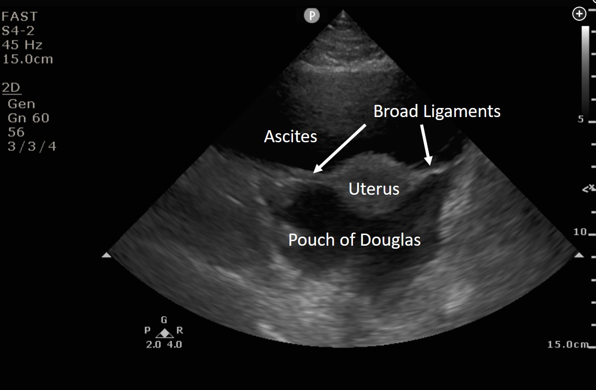 Von Kuenssberg Jehle D, Stiller G, Wagner D. Sensitivity in detecting free intraperitoneal fluid with the pelvic views of the FAST exam. Am J Emerg Med. 2003;21(6):476-478. PubMed ↩