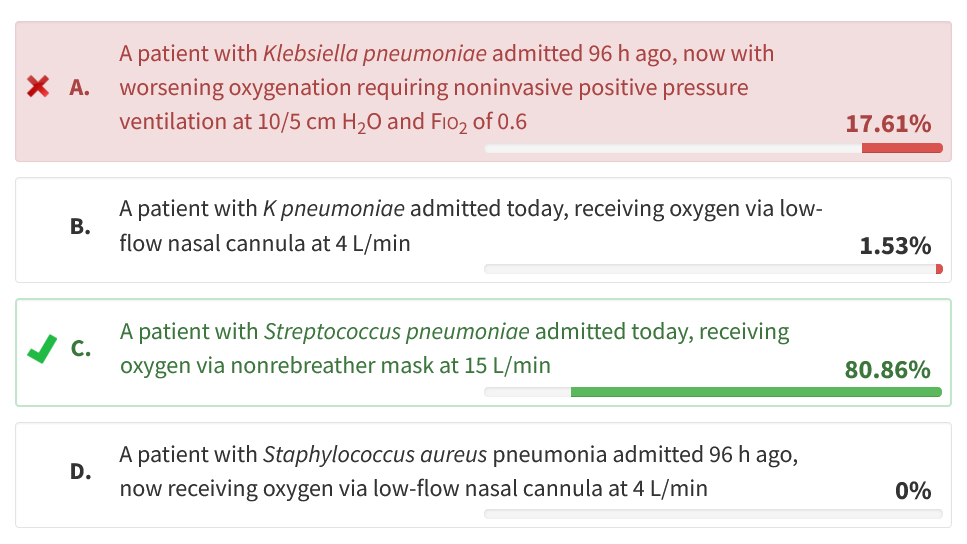 Another large study by the ESCAPe Study Group randomly assigned patients to methylprednisolone 40 mg/day for 7 days, then tapered over 20 days, but they did not see a morbidity or mortality benefit in the steroid group vs placebo. There were two differences between the studies with respect to time to initiation of steroids. In the CAPE COD study, the participants received steroids within 24 h of admission, and in the ESCAPe study, it took up to 96 h for steroids to be administered. Based on these studies, the recommendation is to administer steroids within 24 h for patients admitted with severe CAP (choice A is incorrect). Although admitted within 24 h, patients B and D do not have severe CAP as described in the CAPE COD study. They are receiving FIO2 of less than 0.5 via nasal cannula and do not require an NRB or HFNC (choices B and D are incorrect).234567
