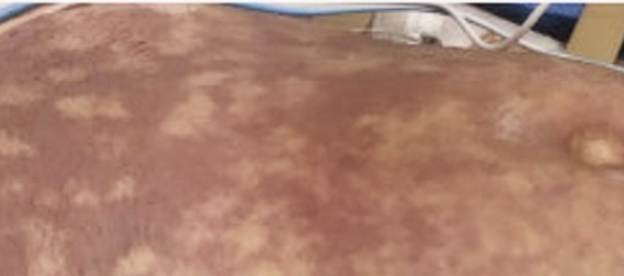 A classic skin lesion in patients with P aeruginosa bacteremia is ecthyma gangrenosum. Usually seen in patients with neutropenia, this manifestation of P aeruginosa infection occurs on the basis of invasion of dermal venules, with secondary thrombosis of the arterioles, tissue edema, and separation of the epidermidis. The resultant skin lesions are characteristically hemorrhagic pustules that evolve into necrotic ulcers with a black (sometimes referred to as gunmetal gray) scab, with the lesion often surrounded by a red halo. This patient is not neutropenic; his epidemiology is not characteristic of P aeruginosa bacteremia (choice A is incorrect).