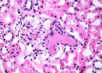 An arteriole at the base of a glomerulus with a few thrombosed glomerular capillaries is seen (400× magnification). Surrounding tissues are renal tubules.
