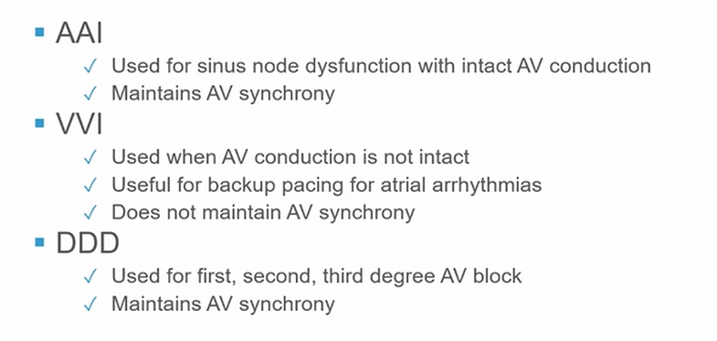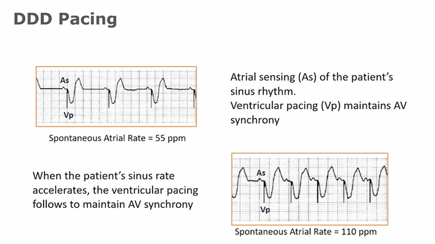 - Best hemodynamic pacing mode. When A speeds up, V speeds up as well.