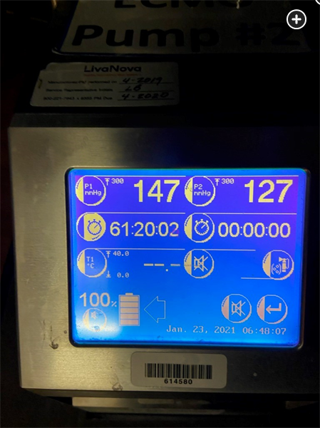 This patient has developed acute hypoxemia on ECMO. The differential is extensive and includes patient, mechanical ventilator, and ECMO circuit factors. In this case, the problem appears to be with the ECMO circuit. The patient does not have any increase in oxygenation across the oxygenator (ie, P1 and P2 PO2 values are almost identical). Two potential causes of this are poor functioning of the oxygenator (usually due to clot formation on the oxygenator surface) or inadequate oxygen supply to the oxygenator. The difference between the P1 and P2 pressures in the ECMO circuit gives an estimate of flow resistance across the oxygenator. The relatively normal difference between the P1 and P2 pressures (20 mm Hg pressure difference) (Figure 1) suggests that the oxygenator is functioning appropriately and is not burdened with significant clot or P2 obstruction. A pressure gradient of 70 mm Hg or more has been cited as a threshold that should prompt oxygenator exchange. Additionally, even with a failing oxygenator, some oxygen transfer should persist. In this case, the P1 PO2 of 32 mm Hg with a P2 PO2 of 35 mm Hg suggests no oxygen transfer by the oxygenator at all. This degree of oxygenator inefficiency is highly unlikely to be due to the oxygenator alone without an oxygen source issue. In this patient, the oxygen supply to the oxygenator was not reconnected to the wall oxygen source and instead was left on the portable oxygen tank that had been used while she was transported to the CT scanner. The portable oxygen tank had run out of oxygen, so the oxygenator was not receiving any supplemental oxygen.
