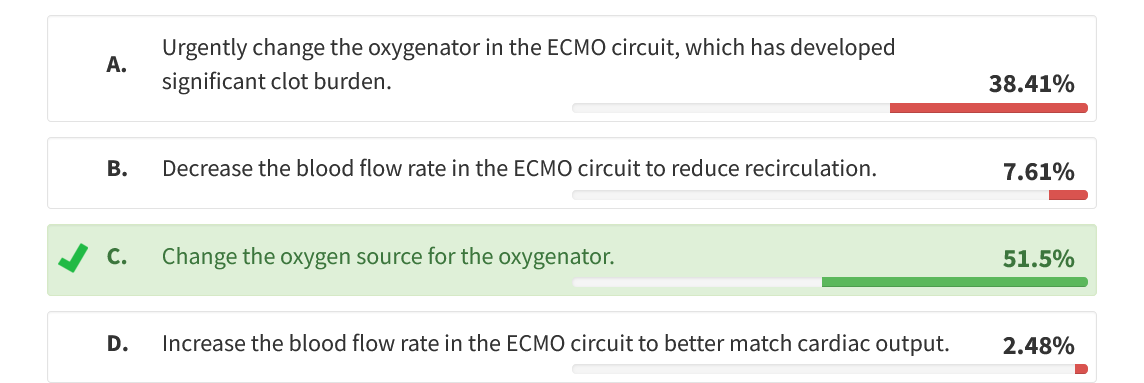 Systemic oxygenation of patients on venovenous ECMO is a confluence of blood returning from the ECMO circuit and venous blood returning from the body and is directly related to the ratio of ECMO flow to cardiac output. Increasing the blood flow through the ECMO circuit will provide a larger volume of oxygenated blood to mix with the deoxygenated venous blood and should raise systemic oxygenation. However, in this patient, the oxygenator is not providing oxygenated blood due to a poor oxygen source. Increasing the blood flow in this scenario will not improve systemic oxygenation and may even worsen the patient’s hypoxemia.12345