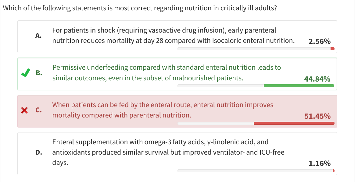 In the Permissive Underfeeding Versus Target Enteral Feeding in Adult Critically Ill Patients (PermiT) Trial, 894 adults (97% mechanically ventilated) were randomized to restriction of nonprotein calories (40%-60% of calculated requirements) or to standard enteral feeding (70%-100%) for up to 14 days. There were no differences in mortality, length of stay (ICU and hospital), ventilatoror ICU-free days, or infectious complications (choice B is correct). In the subset categorized as high nutritional risk, permissive underfeeding was associated with similar outcomes as standard feeding. In the NUTRIREA-2 trial, 2,410 mechanically ventilated patients with shock (on vasoactive drug infusion) were randomized to early first-line enteral or parenteral nutrition, both targeting normocaloric goals. There were no differences in mortality, days without mechanical ventilation or vasoactive support, length of stay (ICU and hospital), or incidence of secondary infections (choice A is incorrect). In the CALORIES trial, 2,388 patients who could be fed through either the parenteral or enteral route were randomized to a delivery route with nutritional support begun within 36 h of admission and continued for up to 5 days. There were no significant differences in mortality at 30 or 90 days or in infectious complications (choice C is incorrect). The OMEGA study randomized 272 patients mechanically ventilated for ARDS to twice-daily supplementation of omega-3 fatty acids, γ-linoleic acid, and antioxidants or to an isocaloric control. Patients receiving the supplement had fewer ventilator-, ICU-, and nonpulmonary organ failure–free days, leading the investigators to conclude that supplementation may be harmful (choice D is incorrect). There was no significant difference in mortality at 60 days.