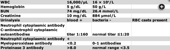 The entire triad (upper airway disease, lower respiratory tract disease, and glomerulonephritis) may not be present initially. Upper respiratory tract symptoms include epistaxis, sinusitis, otitis media, and hoarseness. The associated granulomatous inflammation can lead to oral ulcers (as seen in this patient), nasal septal perforation, saddle nose deformity, and tracheal stenosis. Lung involvement may lead to pulmonary nodules, cavitary defects, infiltrates, or pleural effusion. Renal involvement occurs in approximately 70% of patients and is characterized by rapidly progressive glomerulonephritis. Constitutional symptoms such as fatigue, fever, and weight loss are common. Ocular involvement also occurs frequently.