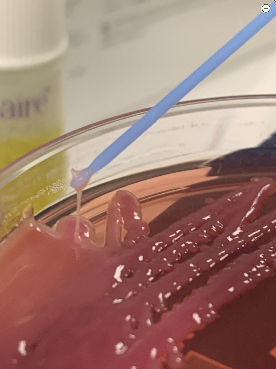 On review of culture data from the debridement and drain placement 1 day ago, you note many lactose-fermenting gram-negative rods, and the microbiology laboratory reported that the agar plate is unusually “sticky” (Figure 2).