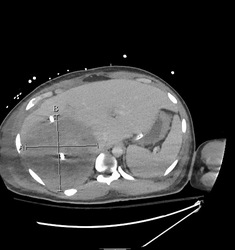 Since that time, he reports progressive malaise and shortness of breath. At the time of ICU transfer, the patient has a heart rate of 150/min, a respiratory rate of 45/min, and systolic BPs in the 90s. He is supported with high-flow nasal cannula, is receiving IV fluids for resuscitation, and repeat blood cultures have been drawn. He is receiving vancomycin and piperacillin/tazobactam. His laboratory evaluation is remarkable for a creatinine level of 2.76 mg/dL (243.98 μmol/L), mild elevation in transaminase levels, and a lactate level of 5.8 mg/dL (0.64 mmol/L). He underwent CT scanning of the abdomen and pelvis, and the scans were remarkable for an enlarging liver abscess now measuring approximately 12.1 × 11.6 × 10.4 cm (Figure 1). The CT scans also demonstrated bilateral, nodular, peripheral densities in the bases with areas of cavitation (not shown).