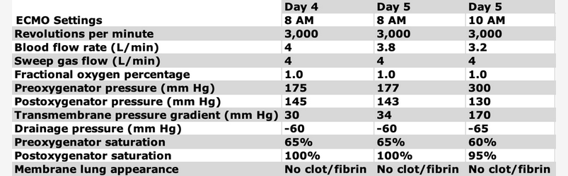 Most often, there are signs of impending membrane lung failure allowing for an elective and controlled exchange. This case did not have signs before the acute membrane failure, leading to an emergent exchange. Ideally, this should be emergent yet coordinated across the multidisciplinary team caring for this patient. During a membrane lung exchange, one team member cares for the patient (eg, optimizes mechanical ventilation, ensures hemodynamic stability) while the other team members manage the ECMO circuit and membrane exchange.3456