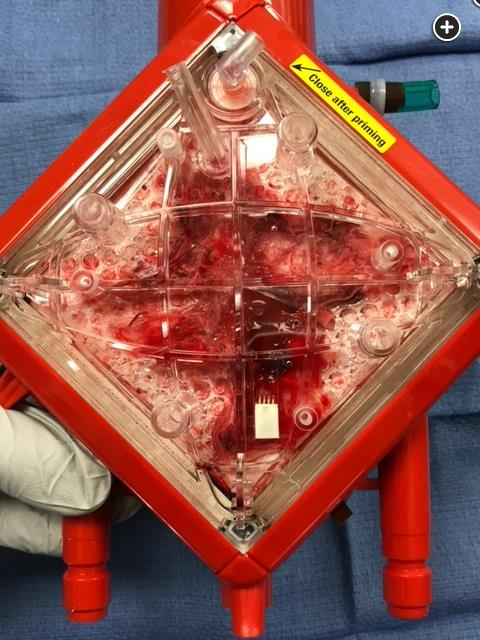 - Membrane lung demonstrating clot after circuit is washed out.