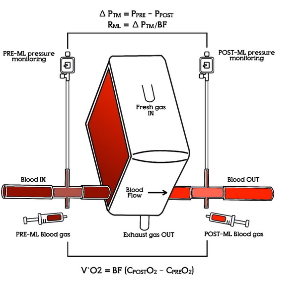 “The pressure drop (ΔP) is calculated as the difference between the preand the post-ML pressure. The resistance within the ML, RML, can be trended as ΔP/circuit blood flow rate (BFR). Oxygen transfer (V’O2) across the ML can be obtained from blood gas analysis as the product of BFR and the difference in oxygen content between the postand pre-ML (CPostO2 – CPreO2).” ML = membrane lung.6