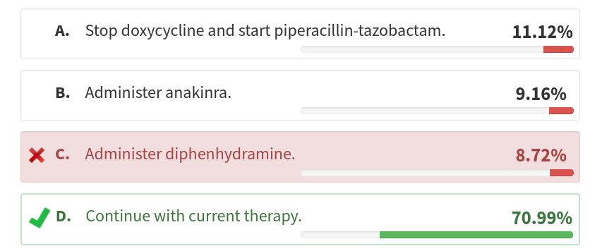 Whether to treat (or, more often, prevent) Jarisch-Herxheimer reactions in patients with spirochetal infections through use of immunomodulators is somewhat controversial. Older data suggest that antibodies against tumor necrosis factor α and/or glucocorticoids may prevent or attenuate a Jarisch-Herxheimer reaction. This has not been well investigated in borreliosis, but in severe cases, glucocorticoid therapy may be reasonable, although the generally benign course of Jarisch-Herxheimer reactions with supportive care argues against routine use of glucocorticoids. In any case, use of anakinra (an IL-1 antagonist approved to treat rheumatoid arthritis and increasingly used off-label to treat hemophagocytic lymphohistiocytosis) is well beyond any available evidence and would not be an appropriate treatment for this patient (choice B is incorrect).