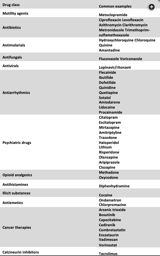A prolonged QT interval (corrected QT [QTc] >480 and >470 ms in women and men, respectively) can be due to either genetic or acquired causes. Acquired long QT syndrome is most commonly associated with drugs—also referred to as drug-induced long QT syndrome—which in combination with other risk factors can lead to life-threatening arrhythmias, including TdP. Other risk factors include advanced age, baseline conduction abnormalities, advanced structural heart disease, inadequate dose adjustment in the presence of liver or kidney disease, electrolyte derangements (hypokalemia, hypomagnesemia, or hypocalcemia), and bradycardic rhythms.
