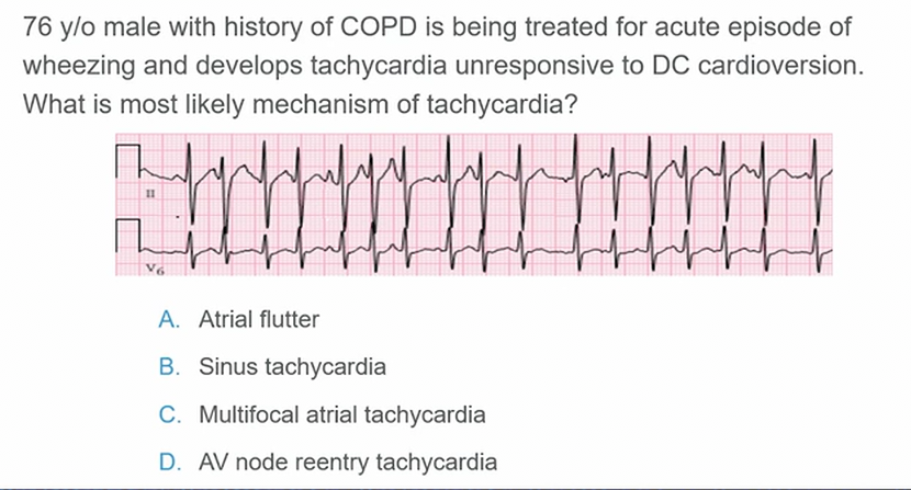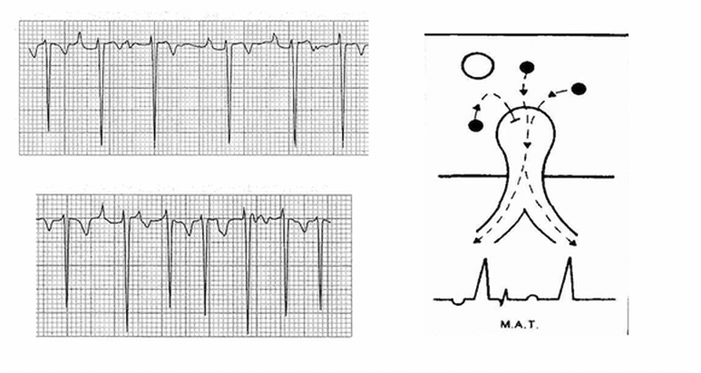 MAT occurs more commonly in patients with COPD, hypoxemia, and underlying pulmonary dysfunction. Other Less common etiological factors include hypokalemia, hypomagnesemia, sepsis, and theophylline or digitalis toxicity.