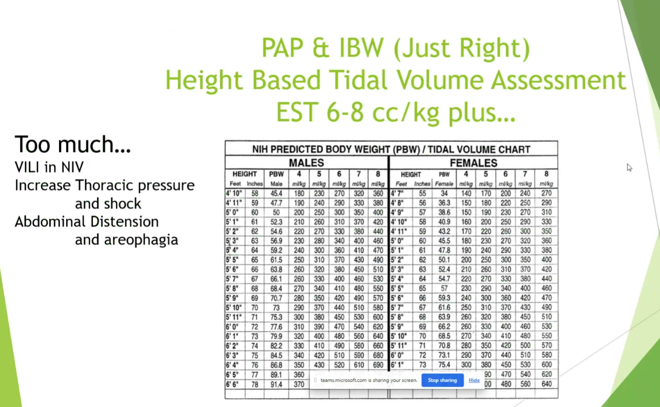 - 6-8 cc/kg + patient’s dead space (around 150cc) should be upper limit target of TV