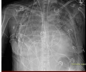 Twenty-four hours later, the patient now develops worsening oxygenation and requires reintubation. There was no witnessed aspiration before this event. There are new bilateral alveolar opacities on a chest radiograph (Figure 1). Vital signs are a temperature of 37.2 °C, pulse of 100/min, and BP of 120/70 mm Hg. SpO2 is 90% with FIO2 of 0.6 and PEEP is 8 cm H2O. Pulmonary artery occlusion pressure is 11 mm Hg. Arterial blood gas measurements are a pH of 7.38, PCO2 of 42 mm Hg, and PO2 of 70 mm Hg. Current medications include methylprednisolone, tacrolimus, mycophenolate mofetil, vancomycin, piperacillin-tazobactam, ganciclovir, posaconazole, and trimethoprim-sulfamethoxazole. There have been no additional blood transfusions. The brain-type natriuretic peptide (BNP) level is normal, and BAL cultures are negative to date. Results of a bedside transthoracic echocardiogram are unremarkable.