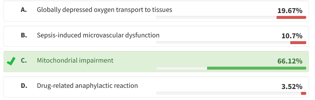 Global depression of oxygen transport has the potential to cause multiorgan failure and lactic acidosis. Although this patient had left ventricular dysfunction, stroke volume was not significantly depressed, and venous oxyhemoglobin saturation was high, arguing against this mechanism (choice A is incorrect). Sepsis is one of the most common causes of multiorgan failure in the postoperative setting. Although negative cultures are common in septic shock, severe cardiac dysrhythmias are not, especially in a young patient (choice B is incorrect). Anaphylaxis can produce bronchospasm and should be considered in the differential diagnosis of shock of uncertain cause. However, skin or mucosal findings (hives, flushing, oral swelling) are commonly present but are lacking in this case. Moreover, there should be a temporal association (minutes to hours) between administration of a likely allergen and the onset of signs (choice D is incorrect). 2345