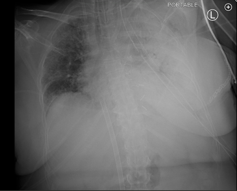 A 50-year-old woman was admitted for left single lung transplant for interstitial lung disease. Her intraoperative course was uncomplicated, with immediate postoperative PaO2 of 306 mm Hg. Upon arrival to the cardiothoracic ICU, she developed acute hypoxemic respiratory failure requiring FiO2 of 1.0, which was associated with new infiltrates in her graft and a PaO2:FiO2 ratio of 89 mm Hg. She was maintained on lung-protective ventilation and placed on venovenous extracorporeal membrane oxygenation (VV-ECMO). No donor-specific antibodies were present. Her oxygenation improved being supported by VV-ECMO, allowing FiO2 to be weaned to 0.40 on the ventilator, but her infiltrates progressed with near-complete opacification of the graft (Figure 1). On postoperative day 1, it was noted that she was no longer spontaneously moving her right upper extremity (RUE) and right lower extremity (RLE). On physical exam, her RUE and RLE did not withdraw from painful stimuli. She underwent emergent head CT scanning. Representative head CT images are shown (Figure 2 and Figure 3).