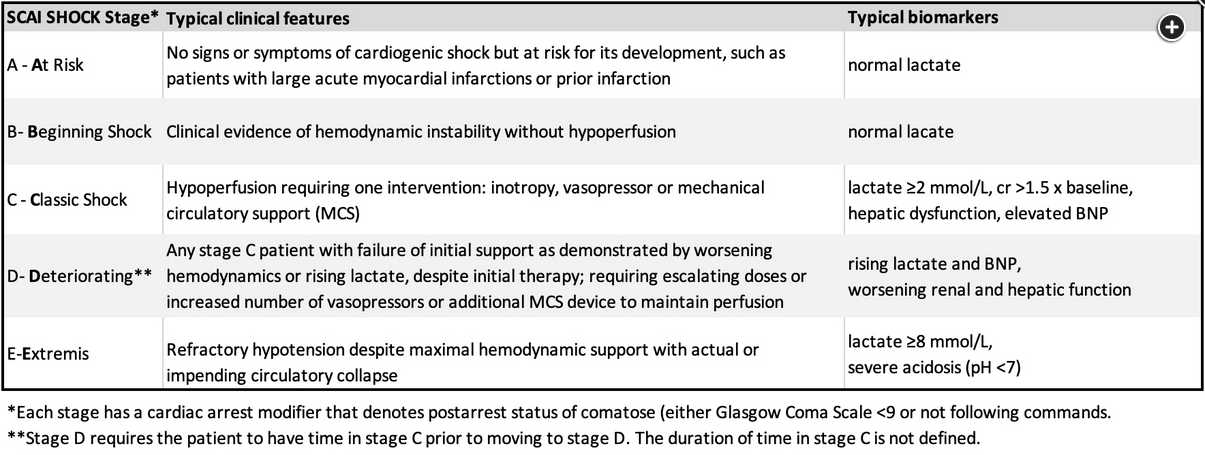 Naidu SS, Baran DA, Jentzer JC, et al. SCAI SHOCK stage classification expert consensus update: a review and incorporation of validation studies: this statement was endorsed by the American College of Cardiology (ACC), American College of Emergency Physicians (ACEP), American Heart Association (AHA), European Society of Cardiology (ESC) Association for Acute Cardiovascular Care (ACVC), International Society for Heart and Lung Transplantation (ISHLT), Society of Critical Care Medicine (SCCM), and Society of Thoracic Surgeons (STS) in December 2021. J Am Coll Cardiol. 2022;79(9):933-946. PubMed ↩