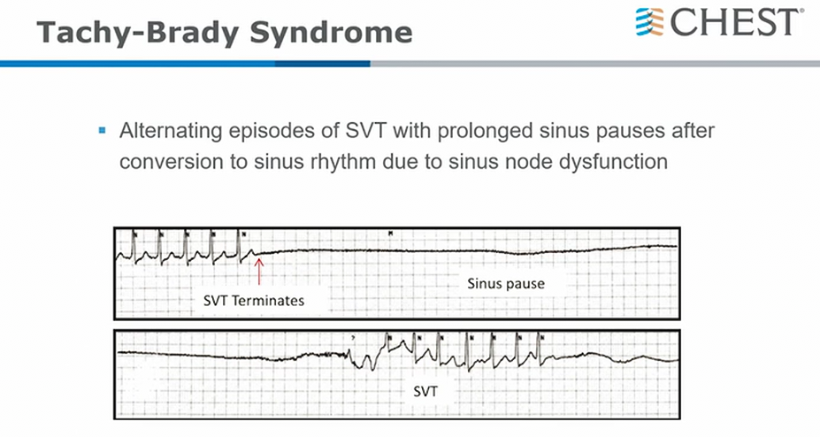 - tachy brady syndrome: SVT/af/aflutter, sinus node shut down from fibrosis/rate control blockade/suppression. At time of conversion, goes into long pauses