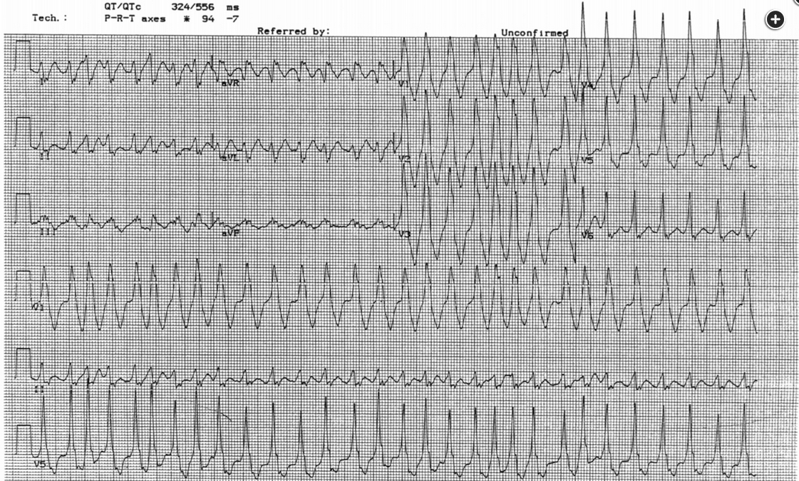 The rhythm is atrial fibrillation—it is irregularly irregular without discernible P waves. Some of the intervals are very short—the interval between the second and third beat is about 220 milliseconds; if sustained, this would correspond to a heart rate of 273/min. The QRS complex is wide in some beats, narrower in others, and in fact, differs from beat to beat. This combination of features makes the diagnosis of Wolff-Parkinson-White (WPW) syndrome with atrial fibrillation.