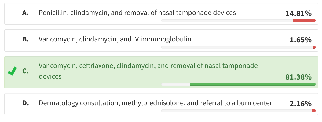This patient has staphylococcal toxic shock syndrome, likely related to the nasal tamponade devices (“nasal tampons,” marketed under multiple brand names). Given the prevalence of methicillin-resistant Staphylococcus aureus (MRSA), especially among patients with frequent exposure to the hospital environment, an empiric treatment strategy for staphylococcal toxic shock must include an agent, such as vancomycin, that is active against MRSA. For source control, removal of the tamponade balloons is necessary. Whether additional source control would be required is unlikely but not impossible. Toxic shock syndromes generally are considered to result from a toxin (hence “toxic”) elaborated by the infecting bacteria, which elicit a response from the host. In the case of staphylococcal toxic shock, the toxin is the unimaginatively named toxic shock syndrome toxin 1, which, as a superantigen, binds to T-cell receptors (generally major histocompatibility complex class II) that then activate an extravagant immune response, disproportionate to the degree of infection and mediated by proinflammatory cytokines. These toxins are part of the S aureus pathogenicity island; together they seem to persist by token of inducing immune dysregulation, which ultimately favors greater reproductive success for the bacteria. While penicillin, clindamycin, and removal of nasal tamponade devices would be appropriate if the pathogen were a Streptococcus species, the risk of MRSA mandates inclusion of an agent effective against MRSA. Vancomycin, clindamycin, and IV immunoglobulin do not achieve source control. While drug reaction with eosinophilia and systemic symptoms syndrome is an important problem encountered in the ICU and can cause organ failure and even hypotension, this is usually accompanied by eosinophilia; in this case, staphylococcal toxic shock is more likely.123