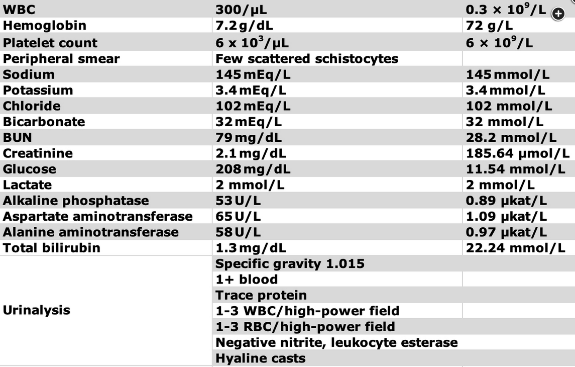 The temperature is 38.2°C, heart rate is 94/min, BP is 183/98 mm Hg, respiratory rate is 22/min, and Spo2 is 94% with the patient receiving 2 L/min supplemental oxygen. The patient is arousable but disoriented and ill appearing. Physical examination results are clinically significant for severe oropharyngeal mucositis; diminished bilateral breath sounds with scattered crackles; and a mildly distended, nontender abdomen. There are a few petechiae, 1+ bilateral lower extremity edema, and a right-side chest wall port without erythema or tenderness. Current laboratory test results are displayed in Figure 1. A chest radiograph demonstrates low lung volumes with mild patchy bilateral infiltrates.