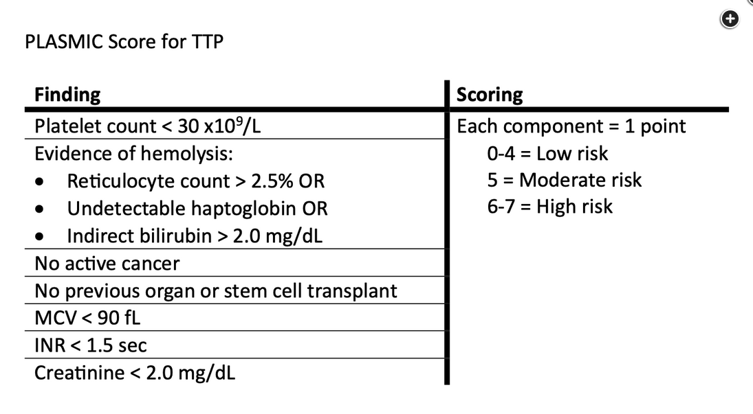 Paydary K, Banwell E, Tong J, et al. Diagnostic accuracy of the PLASMIC score in patients with suspected thrombotic thrombocytopenic purpura: a systematic review and meta-analysis. Transfusion. 2020;60(9):2047-2057. PubMed ↩