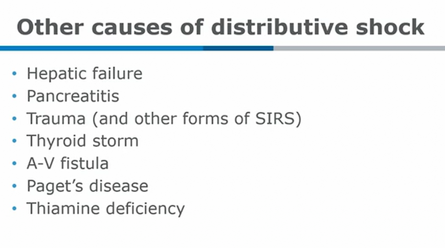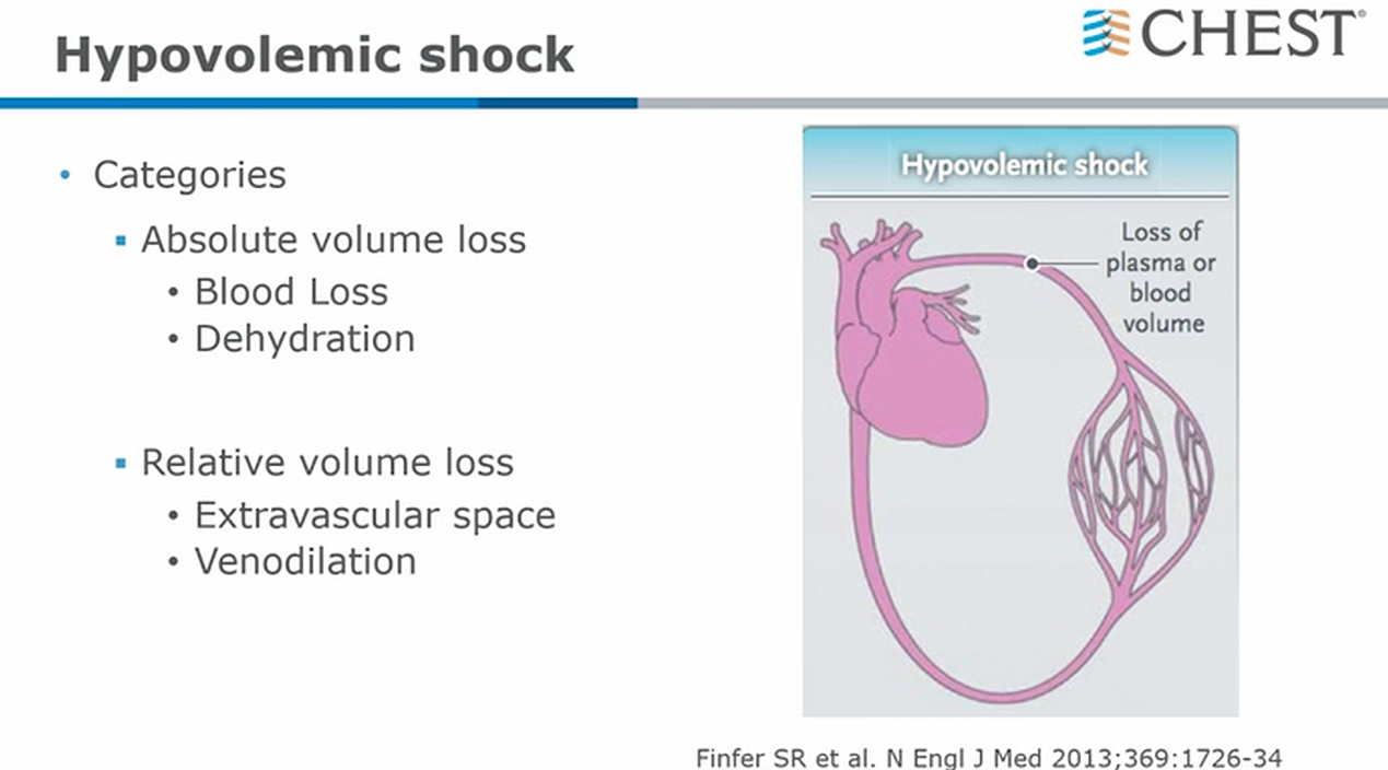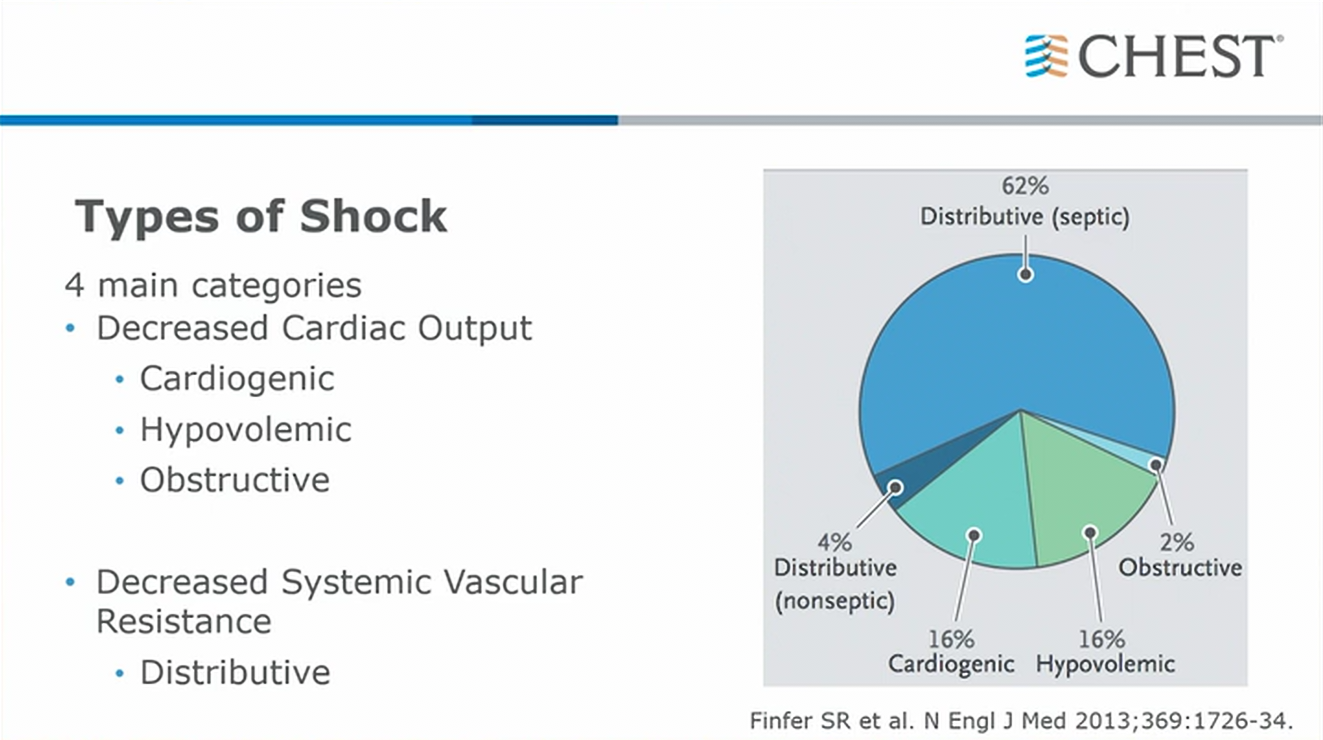 Major types of shock are as follows: cardiogenic, distributive, obstructive, hypovolemic