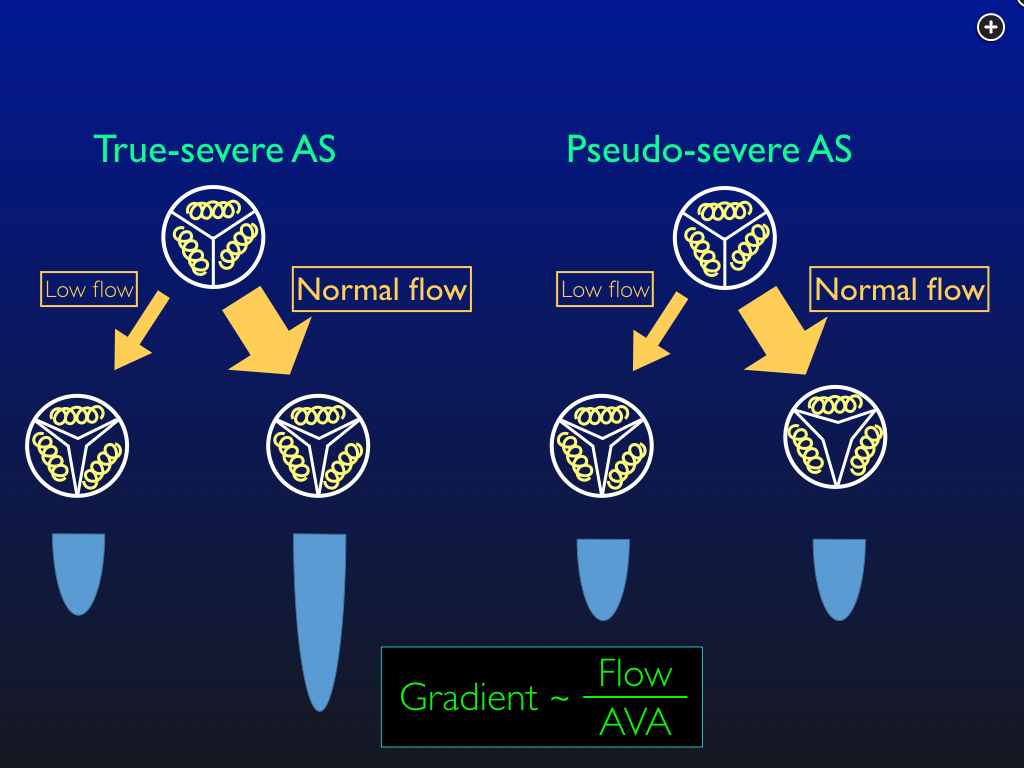Dobutamine stress echocardiography to distinguish true severe aortic stenosis from pseudo-severe AS. With true AS, an increase in flow with dobutamine increases the gradient across the valve, and the calculated valve area is unchanged. With pseudo-AS, dobutamine increases the force of contraction and opens the valve, increasing flow. The gradient is unchanged, and so the calculated aortic valve area is increased. an increase in flow opens the valve. Abbreviations: AS: aortic stenosis. AVA: aortic valve area. The velocity-time integrals, which are proportional to the gradients, are depicted in blue.