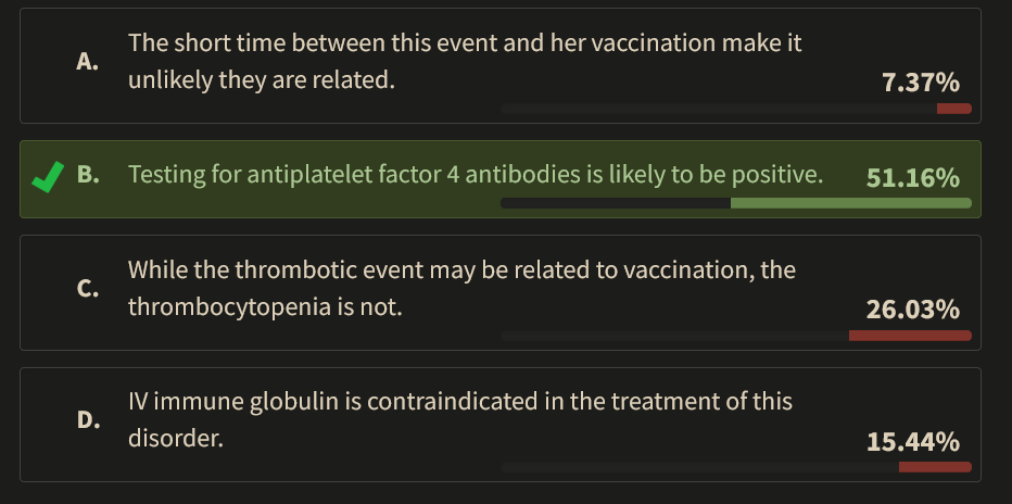 A 28-year-old female nursing student is admitted to the ICU for obtundation following a seizure treated in the ED. One day ago, she experienced a severe headache that was unresponsive to acetaminophen. Today, her family observed a generalized tonic-clonic seizure, and emergency medical services were summoned. She was obtunded en route to the hospital and then had another generalized seizure during her initial evaluation by emergency medicine staff. Her seizure responded to IV lorazepam, and she was loaded with IV levetiracetam. Her laboratory studies in the ED were remarkable only for a platelet count of 62 x 103/μL (62 x 109/L). Neuroimaging after she was stabilized included magnetic resonance venography, which revealed a superior sagittal sinus thrombosis. The patient’s family describes her to be in excellent health, having never been hospitalized and taking no medications. Three months ago, on entry to nursing school, a general exam was normal as was a complete blood count. One week ago, she received an adenoviral vector-based vaccine and had no adverse reaction. 12345