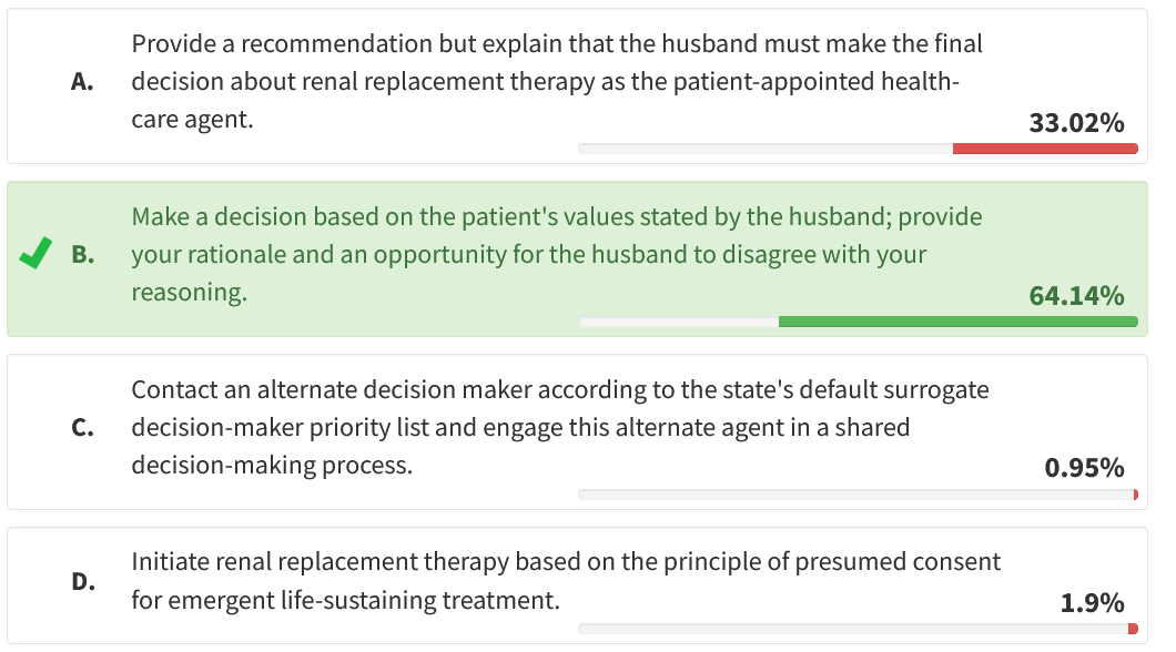In clinician-directed decision making, the physician is still responsible for ensuring that the patient or surrogate understands the decision and the rationale. However, in a clinician-directed model, the physician makes the ultimate treatment decision based on his or her understanding of the patient’s values, goals, and preferences (ie, not based on the clinician’s values or other default care options) (choice D is incorrect). It is important to provide an opportunity for the surrogate or patient to disagree with the decision before proceeding with the plan of care. Pursuing a clinician-directed decision-making model is an acceptable approach to preference-sensitive decision-making, so it is not necessary nor appropriate in this case to tell the husband that he must make the decision after he has already clearly deferred the decision to the clinician (choice A is incorrect). Deferring the decision to the clinician does not imply that the surrogate is deferring their role as the surrogate decision maker (choice C is incorrect).1234
