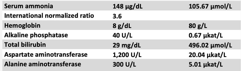 Some of her notable laboratory tests are shown in Figure 1. Pregnancy test is negative, and serum acetaminophen level is undetectable.